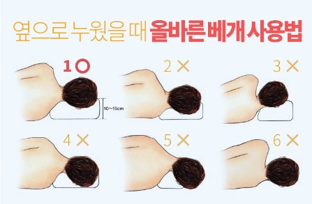옆으로 누워 자는 경우에는 옆에서 보았을 때 목뼈와 허리뼈가 일직선을 유지하도록 하며, 어깨 높이를 고려한 베개 높이를 권장합니다.