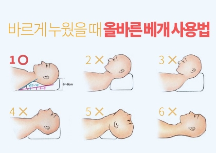 우선 바르게 누워서 자는 자세가 척추 건강에 가장 좋습니다. 그림 1번처럼 목이 C커브를 유지하며 근육의 긴장감이 없도록 해주는 베개를 사용해야하며, 베개의 높이는 비교적 낮아 목과 허리에 부담을 주지 않아야 합니다.