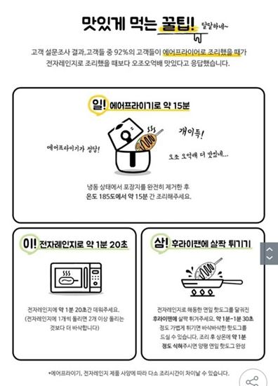 맛있게 먹는 꿀팁으로 에어프라이기 조리를 추천했습니다.