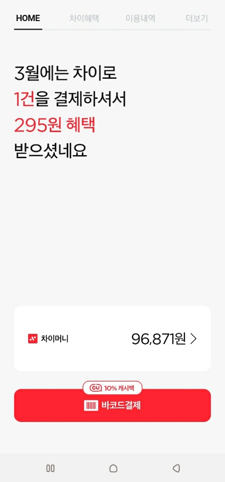 차이 오프라인 결제는 차이앱 홈 화면 하단에 바코드결제 로 가능합니다.