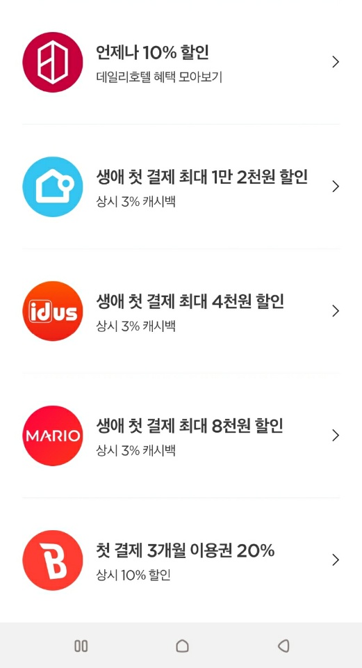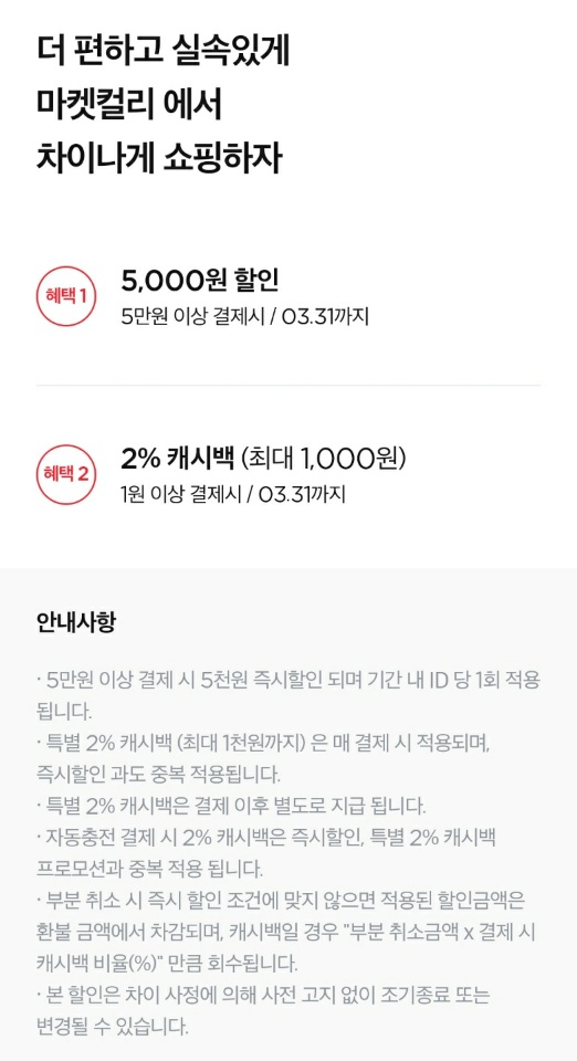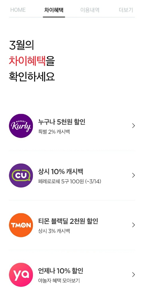 이 외에도 야놀자 10% 할인 (최대 5,000원 할인) / 데일리 호텔 10% 할인 (최대 20,000원 할인) / 오늘의 집 & 아이디어스 & 마리오아울렛 상시 3% 캐시백 및 첫결제 할인 / 벅스 10% 할인이 3월의 차이 프로모션으로 확인됩니다.
