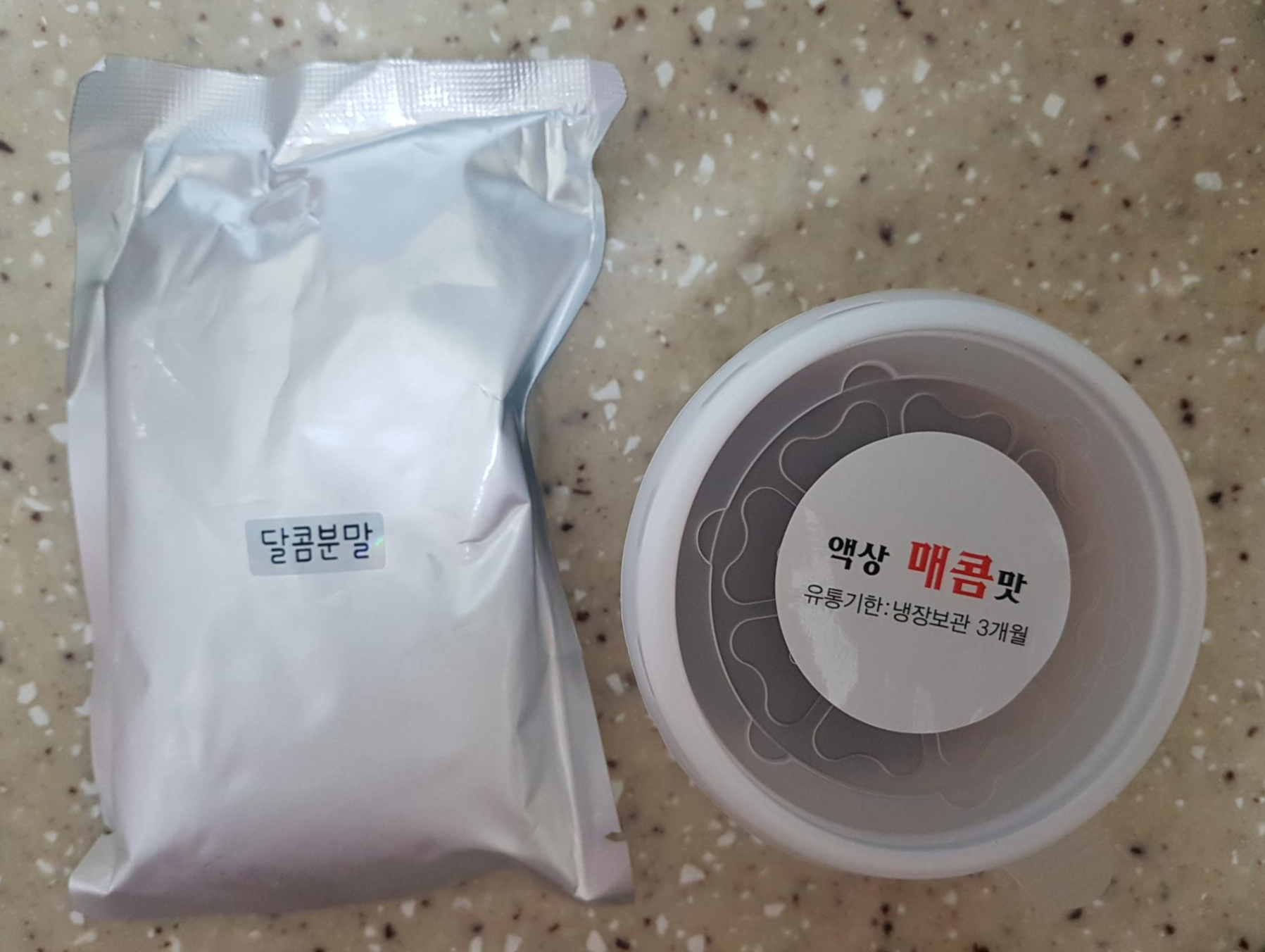 [달매] 떡볶이를 만들기 위해 매콤 소스 절반과 잘 섞은 달콤 소스 가루 절반을 사용했구요.