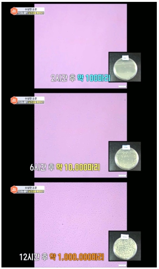 아래는 그 실험 결과로 일회용 인공눈물 개봉 12시간 후 세균이 백만마리로 증식된걸 확인할 수 있습니다.
