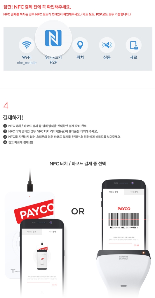 페이코 오프라인 결제방법은 바코드 또는 NFC 터치 중 선택 가능하며, NFC터치 결제 방식을 이용할 시에는 핸드폰의 NFC 모드를 ON 해주셔야 합니다.