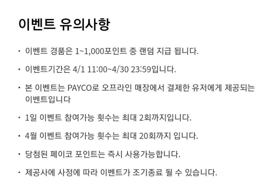 오프라인 매장에서 페이코로 결제 시 포인트를 지급하는 이벤트로 1~1,000포인트 중 랜덤 지급됩니다.