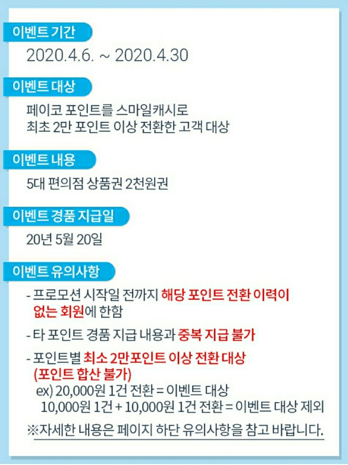 그리고 페이코 포인트를 스마일캐시로 최초 전환 시 편의점 상품권 2,000원권을 지급하는 이벤트도 진행합니다.