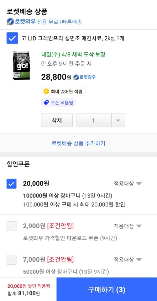 저는 10만원을 채워 2만원 할인을 받았고 구매 품목은 강아지 관절영양제 - 글라이코 플렉스3 / 강아지 사료 - Go! 그레인프리 칠면조 사료 2kg / 강아지 열빙어 간식 - 마도로스펫 열빙어트릿 입니다.
