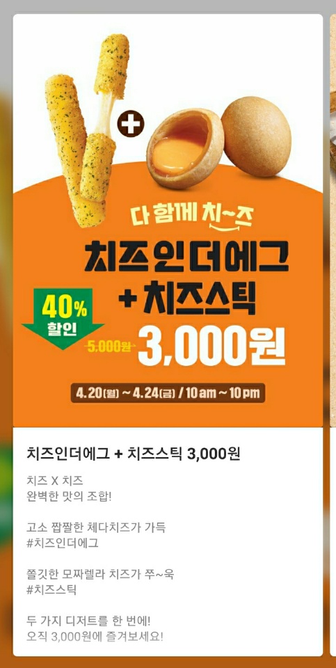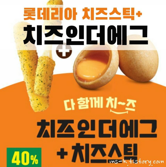 체다치즈의 단짠맛 치즈인더에그를 치즈스틱과 함께 40% 할인된 가격에 즐길 수 있다니 이번 기회에 꼭 맛봐야겠어요 :)