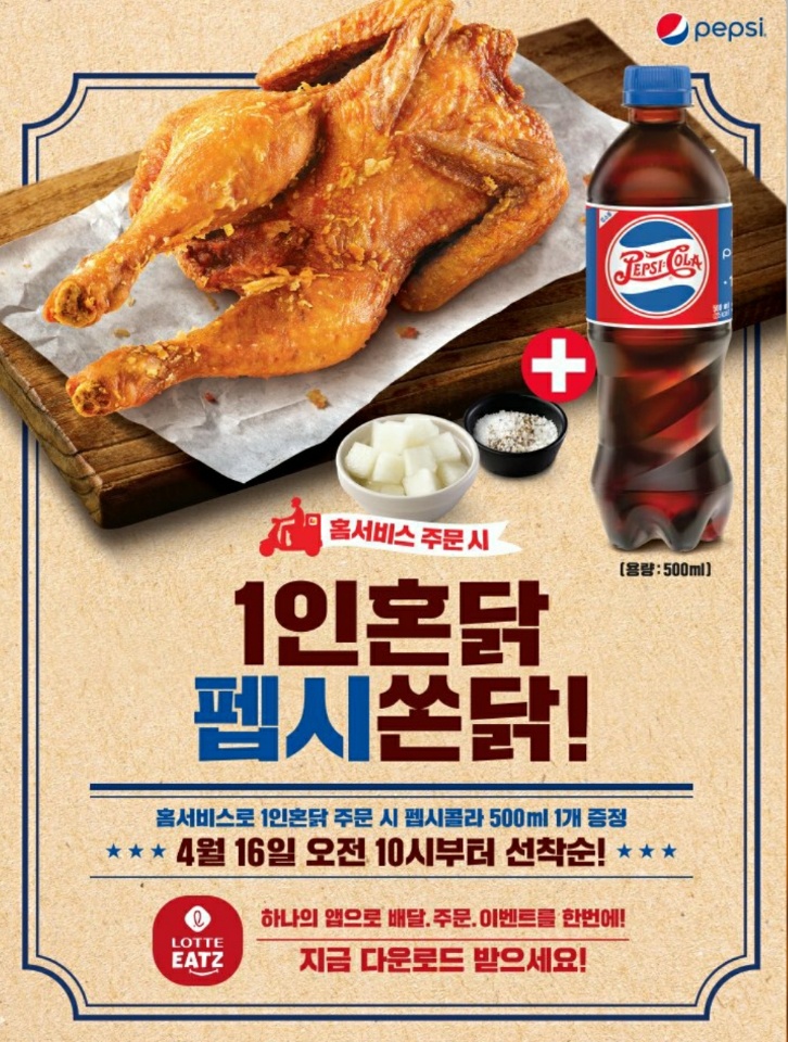1인혼닭 홈서비스 주문 시 선착순 펩시콜라 500ml 증정 & 새우/치킨버거 만렙세트