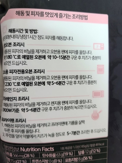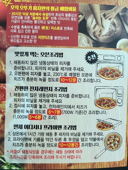 전자레인지가 아닌 오븐이나 에어프라이로 조리하면 조금 더 나을까 싶지만, 재구입 하고 싶은 마음은 전혀 들지 않습니다. 치즈가 너무 많아 토핑 맛이 거의 느껴지지 않았고 도우 끝부분도 너무 두꺼워 먹기 부담스러웠습니다.