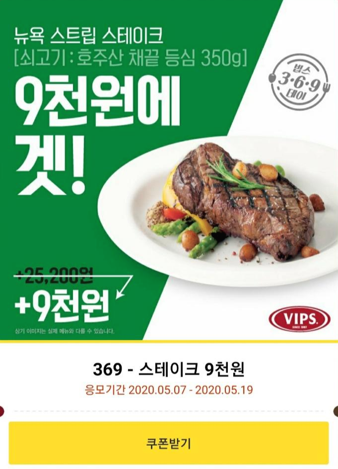 VIPS 카카오 플러스 친구 등록을 하시면 빕스 스테이크를 3천원, 6천원, 9천원에 즐길 수 있는 빕스 스테이크 할인 쿠폰을 받을 수 있습니다.
