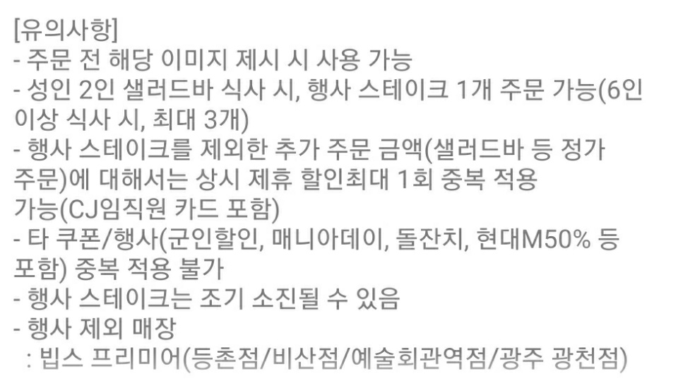 행사 스테이크를 제외한 추가 주문 금액 (샐러드바 등 정가주문) 에 대해서는 상시 제휴 할인 최대 1회 중복 적용 가능합니다.