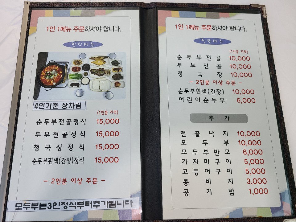 1인 1메뉴 주문은 필수이며, 정식과 일반 메뉴 중 선택할 수 있습니다. 저희는 순두부전골 정식을 주문했어요!