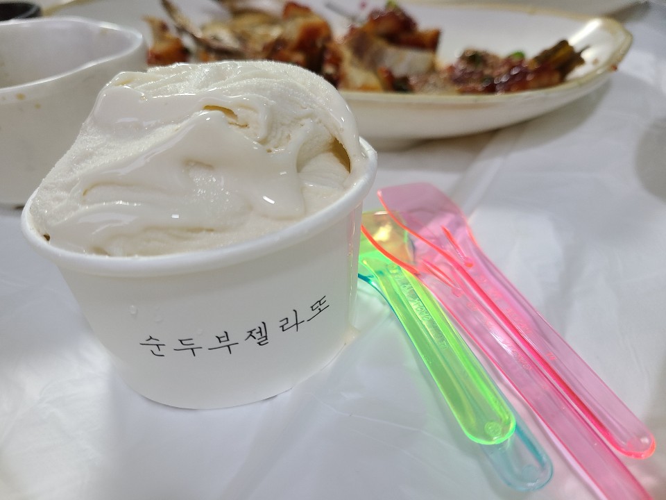 매콤하고 뜨거운 순두부전골을 먹은 뒤 맛보는 순두부젤라또는 너무나 꿀맛이었어요. 부드러우면서도 쫀득하고, 고소하면서도 달콤한 시원한 젤라또는 초당두부마을에 너무나도 어울리는 디저트 메뉴가 아닌가 싶었습니다.