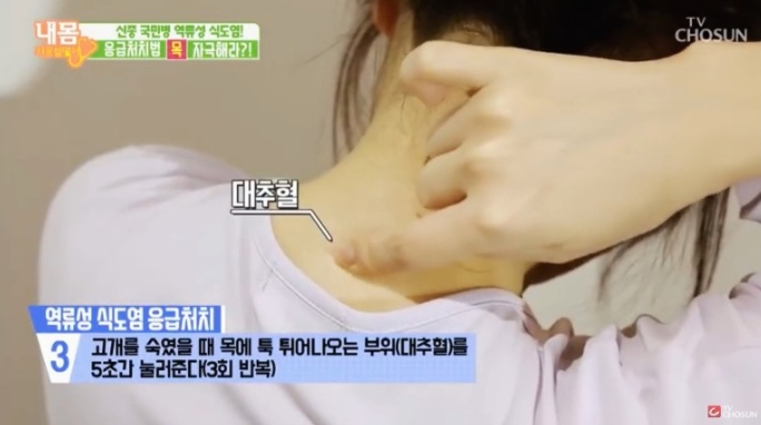 역류성 식도염 응급처치 방법으로 부돌혈을 5초간 3회, 대추혈을 5초간 3회 마사지해주면 좋습니다.