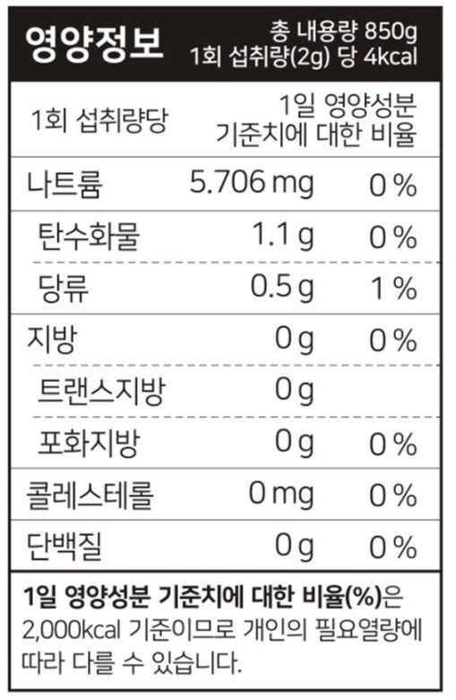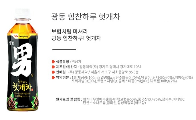 광동 헛개차의 경우 헛개나무열매추출농축액이 주성분으로 나왔는데 고형분이 50%라 하면 그 외에는 뭐가 들어간 건지 자세히 알 수는 없네요. 영양정보를 비교해 봐도 하루헛개는 헛개수 원액 기준이라 1회 섭취량 2g 기준으로 표기되어 있고 광동 헛개차는 1회 제공량 100ml 기준이라 비교가 어려운 것 같습니다. 눈에 띄는 차이점으로는 하루헛개의 경우 당류가, 광도 헛개차는 나트륨이 유효한 %로 표기되어 있다는 정도네요.
