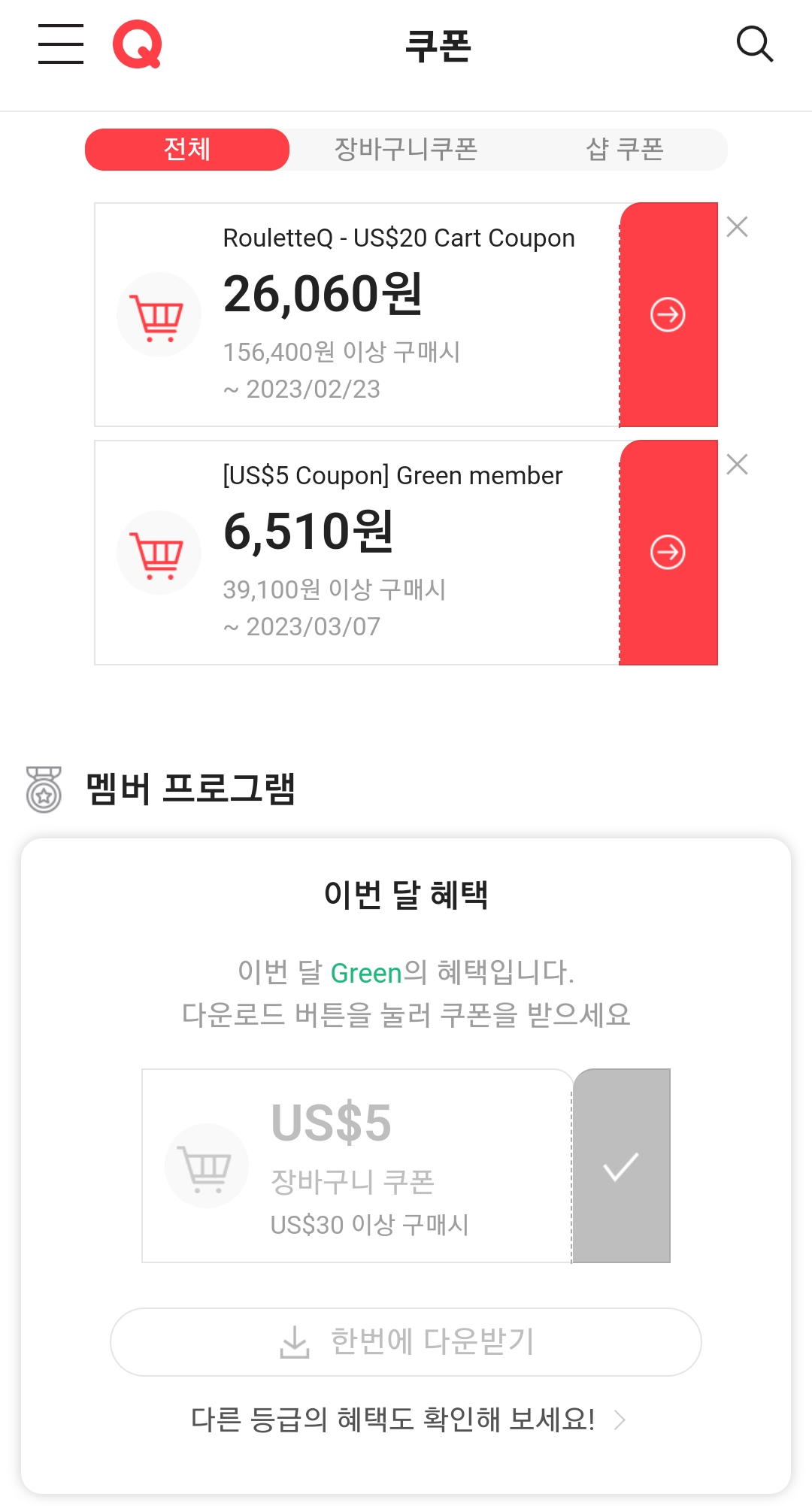 저는 일본 직구는 카베진 외에는 구입하는 것이 없어 이용하고 있는 앱은 큐텐 = Qoo10 단 한 곳입니다. 아주 가끔씩만 이용하는 기본 회원인데도 매달 쿠폰을 지급해 주고, 할인쿠폰 이벤트도 거의 상시 있는 것 같아요. 그리고 하루 한 번씩 출석 체크만 해도 응모권이라는 것을 주는데, 그걸로 룰렛을 돌려 랜덤으로 할인쿠폰을 받을 수도 있습니다.
