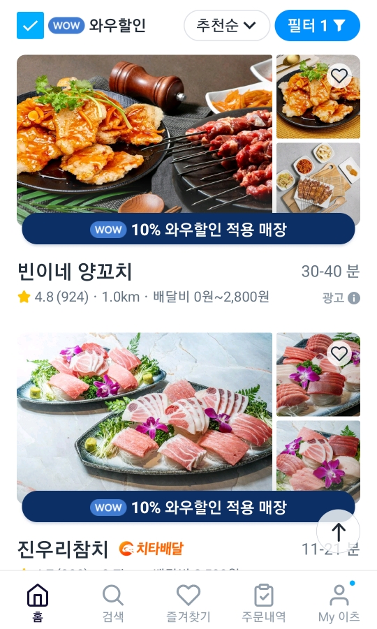 주문 시점에서 와우할인 적용 매장으로 표기된 곳에서만 할인을 받을 수 있다는 게 조금 아쉬울 수 있는데, 생각보다 많은 곳들이 와우할인 적용되어 있었습니다. 그리고 아직 서비스 초기인 만큼 앞으로 더 많은 곳들이 와우할인 적용되지 않을까 하는 기대도 하고 있어요.