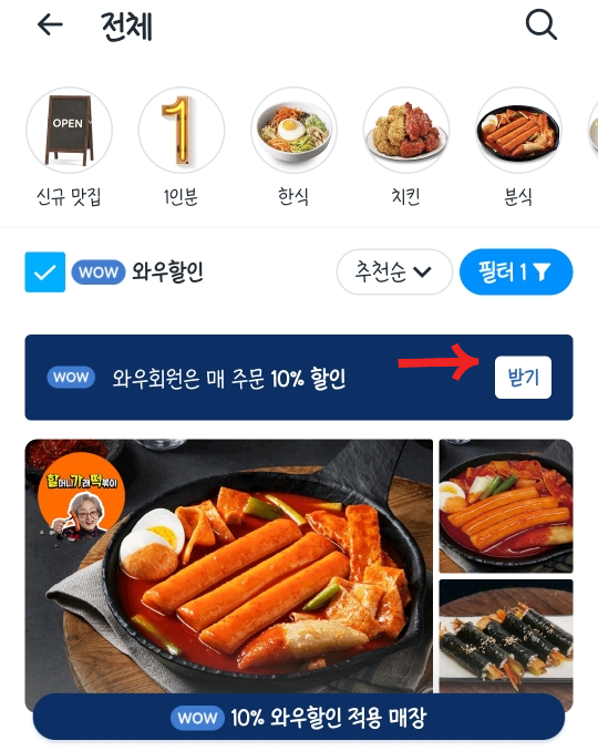 와우회원이 아니시라면 아래 화면처럼 와우외원은 매 주문 10% 할인 옆에 '받기'버튼을 눌러 와우 멤버십에 가입한 뒤 이용하실 수 있습니다.