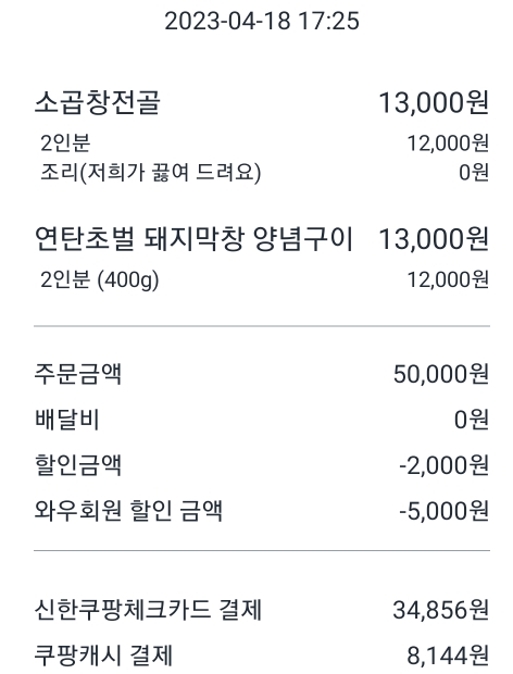 위 사진은 제가 실제로 쿠팡이츠에서 주문했던 내역, 영수증인데요. 가게에서 제공하고 있는 쿠폰들까지 결제 시 자동으로 중복으로 적용되어 (할인금액 -2,000원으로 표기된 부분) 할인받은 금액이 쏠쏠합니다. 그 외에 본인이 보유하고 있는 쿠폰도 중복 사용이 가능하고, 쿠팡캐시도 사용할 수 있어 더 좋은 것 같아요!
