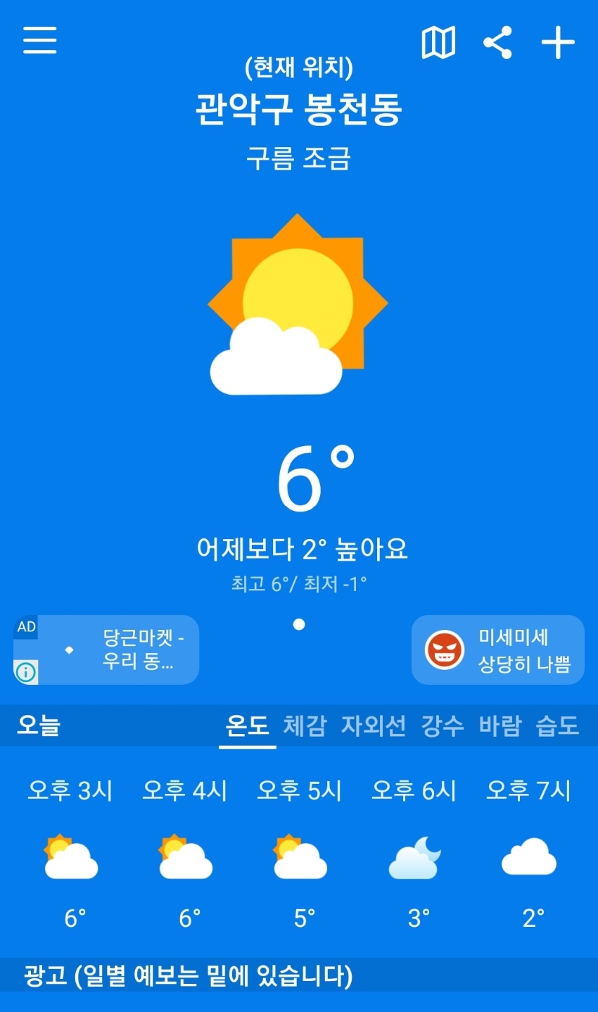 저의 경우 겨울엔 온도를 봐도 날씨 예상이 잘 안되요. 바람과 습도 등 영향으로 실제 온도와 체감온도의 차이가 큰 경우가 많잖아요? 날씨날씨 어플에서는 온도, 체감온도 따로 확인이 가능하고 항상 어제와 비교해 어제보다 몇도 높다, 몇도 낮다까지 한 눈에 확인할 수 있게 표기해주니 날씨 예측이 한결 쉽습니다.