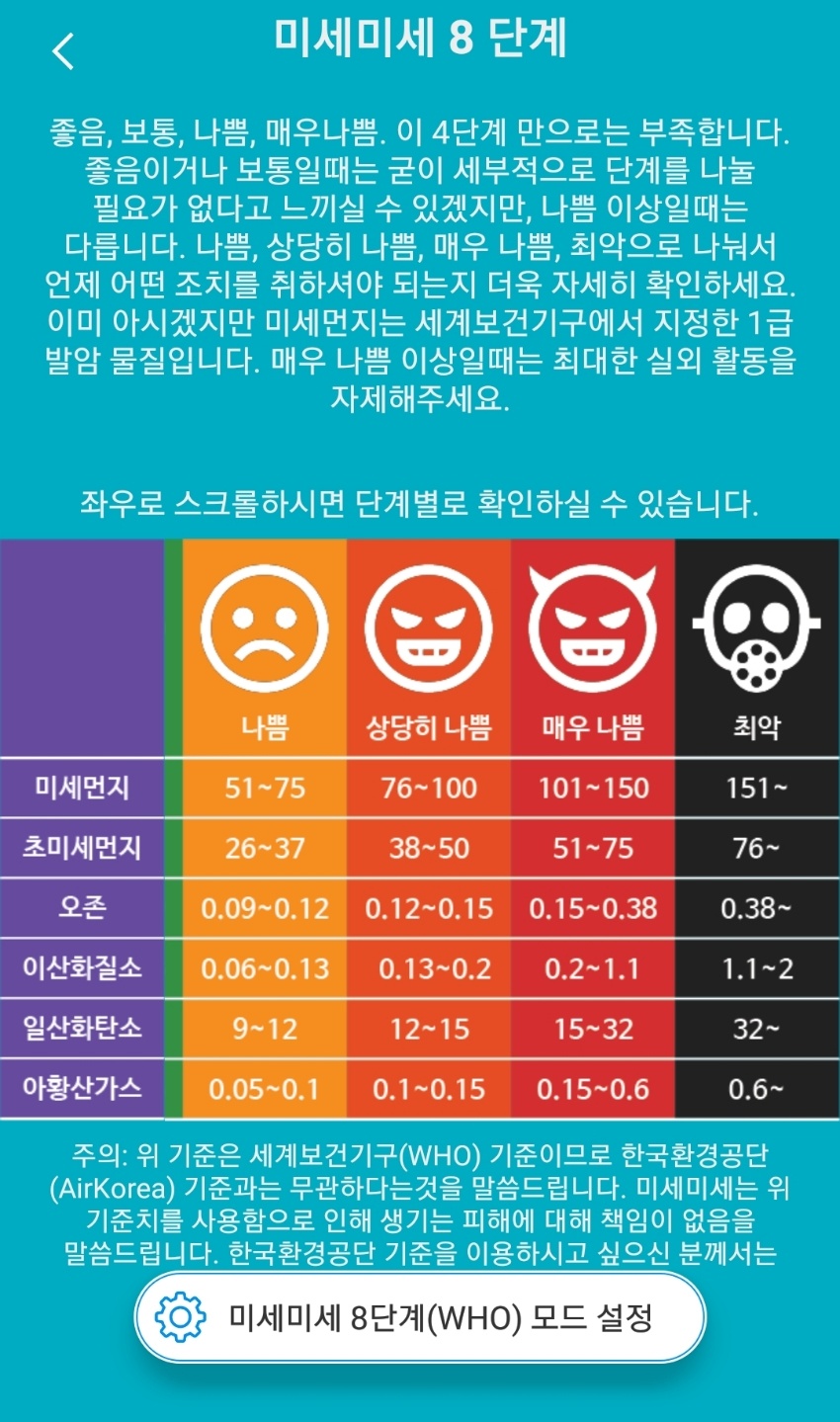 첫번째, 날씨날씨 어플의 장점은 미세미세 어플과의 연동으로 미세먼지 수치를 제가 원하는 세계보건기구 기준으로 확인할 수 있기 때문입니다. (물론 한국환경공단 기준인 4단계로도 변경이 가능해요)