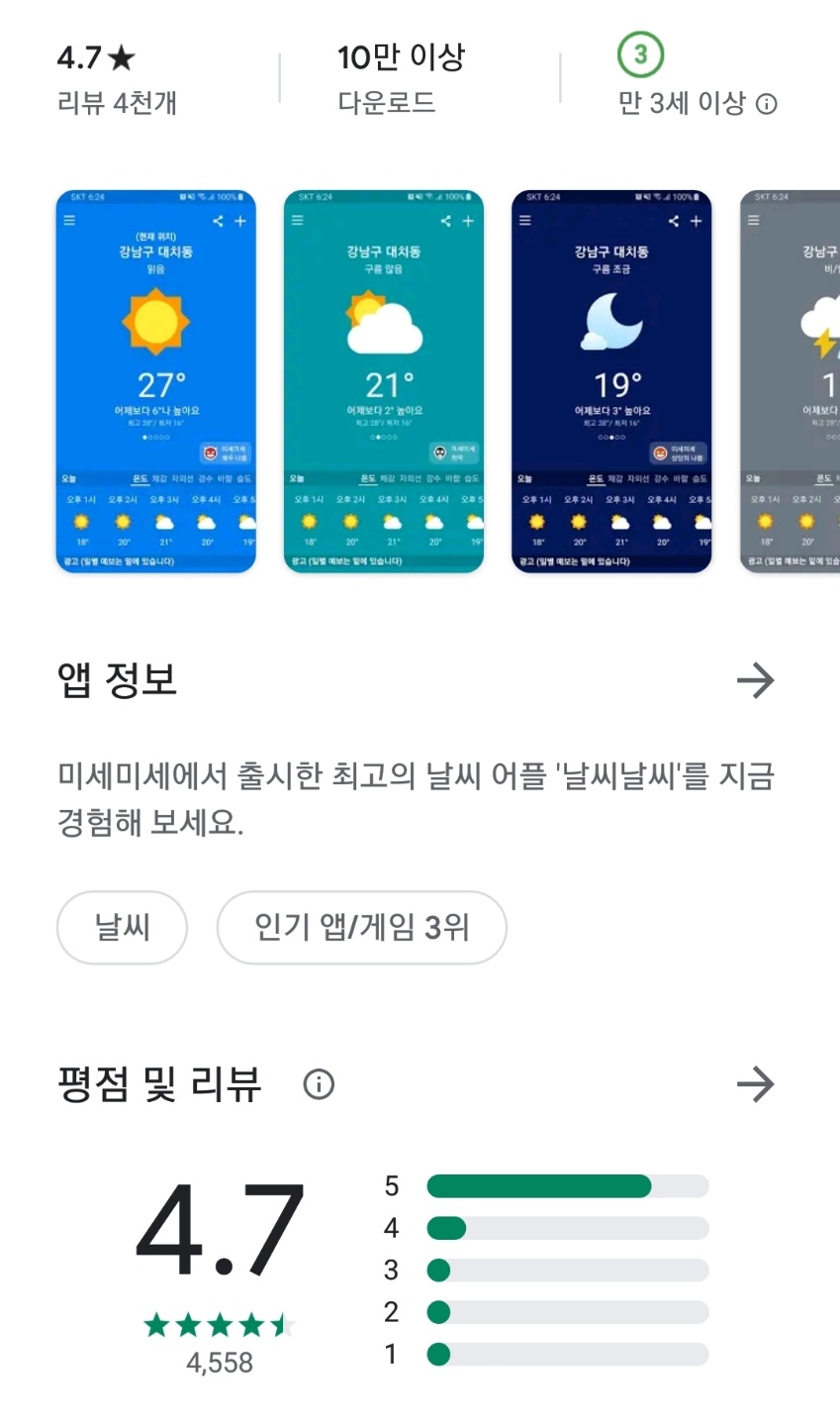 혹시 미세미세라는 어플 아시나요? 한참 미세먼지로 난리 났을때 개발된 앱이었는데 입소문이 많이 나서 지금은 500만 사용자가 이용하고 있는 미세먼지 어플이라고 합니다. 저는 미세미세를 참 잘 사용하고 있었는데요, 미세미세에서 날씨 어플인 날씨날씨를 출시했습니다! 저는 벌써 반년정도 꾸준히 사용했고, 만족스러워서 이제는 날씨날씨로만 날씨와 미세먼지를 확인하고 있네요. 날씨날씨 어플은 저 아닌 다른 사용자들의 만족도도 평점 4.7로 꽤 높은편에 속합니다.