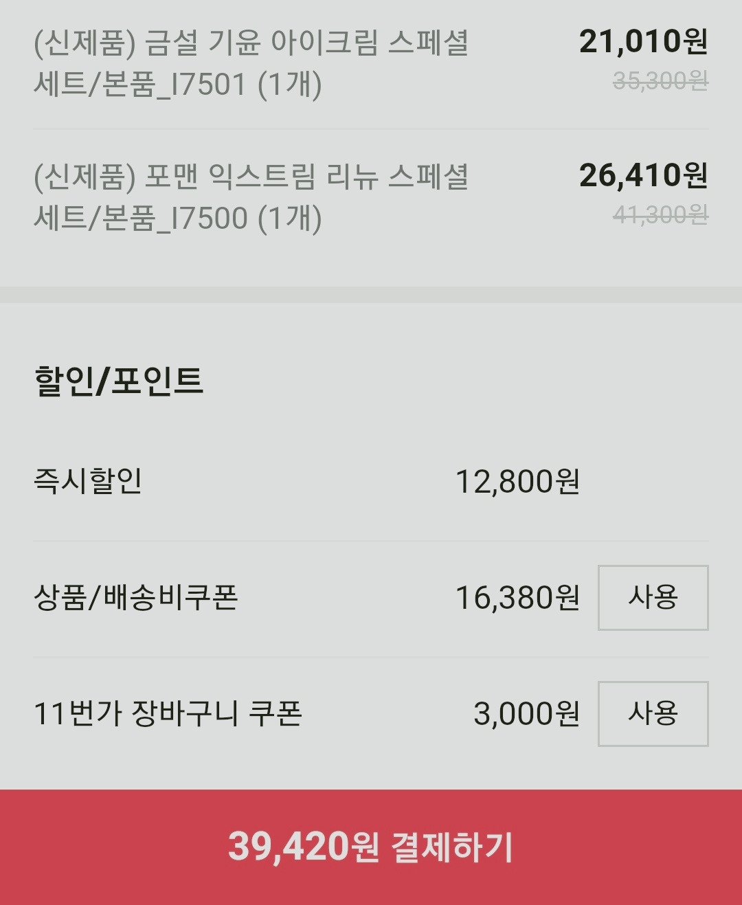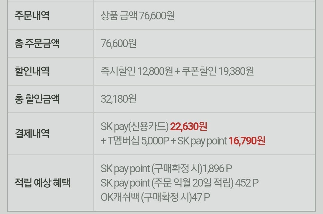 두 제품 모두 10% + 20% 중복쿠폰 적용했고, 두가지를 함께 구입하니 30,000원 이상 구매 시 사용 가능한 장바구니 쿠폰 3,000원도 사용할 수 있었어요. 그리고 전 SKT이라 T멤버십 5,000P 할인을 받았고, SK pay 11번가 신용카드를 사용하고 있어 누적되어 있던 포인트 16,790원을 사용했습니다. 그랬더니 실제 결제 금액은 22,630원♥ 이거 정말 꿀구매 아닌가요? (11번가 쇼핑 자주 하시는 분들 SK pay 11번가 신용카드 포인트 정말 잘 쌓이고 좋아요! 추천~)