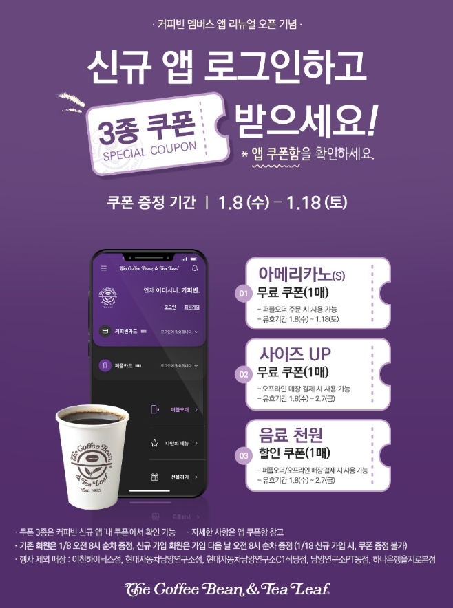 커피빈 쿠폰 3종의 경우 커피빈 신규 멤버스 출시 기념 프로모션이라 기한 한정이예요. 1월 18일까지가 쿠폰 증정기한이지만 신규 가입 회원의 경우 가입 다음 날 오전 8시에 쿠폰이 순차적으로 증정 되기 때문에 17일까지는 가입을 하셔야 커피빈 3종 쿠폰을 지급 받을 수 있습니다. 신규 회원이시라면 내일 안으로 커피빈 신규앱 가입 및 로그인 하셔서 3종 쿠폰 받으시고, 아메리카노(s) 무료 쿠폰의 유효기간은 18일까지로 빠른 사용하셔야 할 것 같네요.