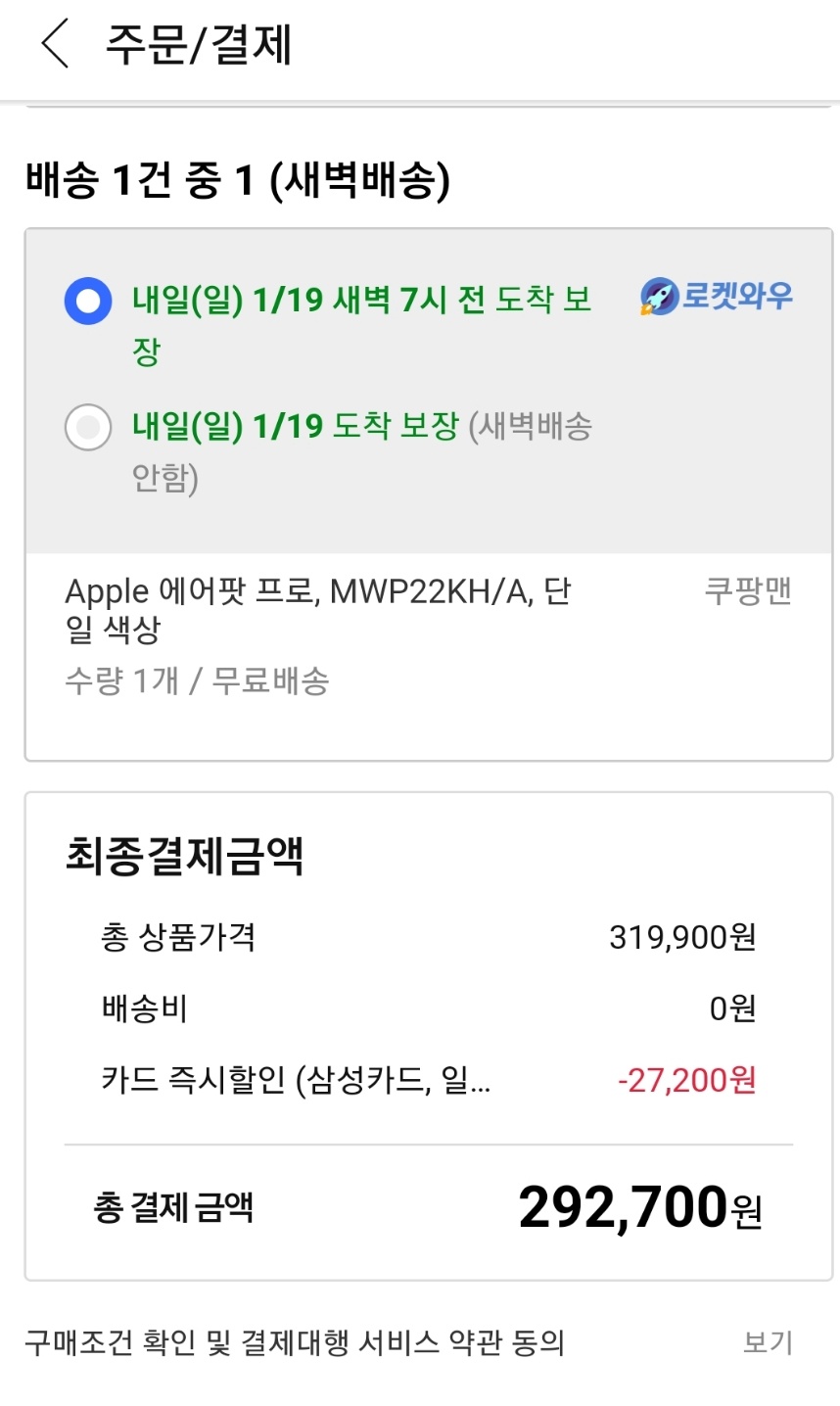 오늘 소개드리는 에플 아이팟 프로는 삼성카드로 구매 시 10% 즉시할인 받아 현재 인터넷 최저가로 구입이 가능한데요. 제가 직접 구매 페이지를 들어가서 확인한 결과 현재 아이팟 프로 인터넷 최저가 292,700원에 구입이 가능합니다.
