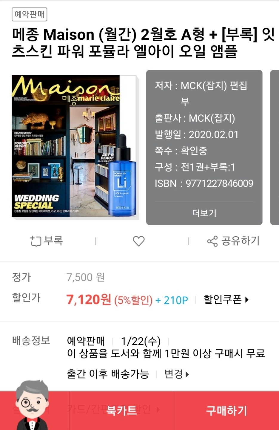 마지막으로 얼루어 코리아 2월호 부록은 메이크힐 히든 트라이앵글 아이 팔레트 4종 중 1종 랜덤 증정이며, 메종 2월호 부록은 잇츠스킨 파워 포뮬라 엘아이 오일앰플 입니다. 잡부에서 색조제품을 랜덤 증정하는 경우가 많은데, 색조는 취향이 뚜렷하다보니 비선호 색상이 왔을 경우 못쓰게 되는 경우가 많아 색조 잡부는 잘 안사게 되는 것 같아요. 저만 그런가요^^?