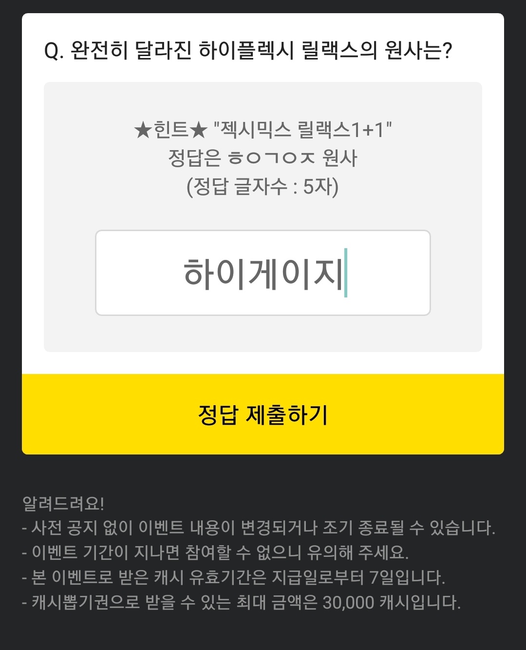 젝스믹스 초성퀴즈 문제는 Q. 완전히 달라진 하이플렉시 릴랙스의 원사는? 이며, 힌트는 "젝시믹스 릴랙스 1+1"