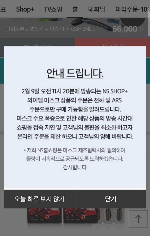 그리고 ns홈쇼핑은 9일, 자사 T커머스 채널인 NS샵플러스에서 오전 11시 21분부터 KF94 와이엠 황사 보건용 마스크 1500세트를 추가 판매가 예정되어 있는데요. 이번에는 8일 방송과는 다르게 전화와 ARS 주문으로만 구매가 가능하다고 안내문이 떴습니다.